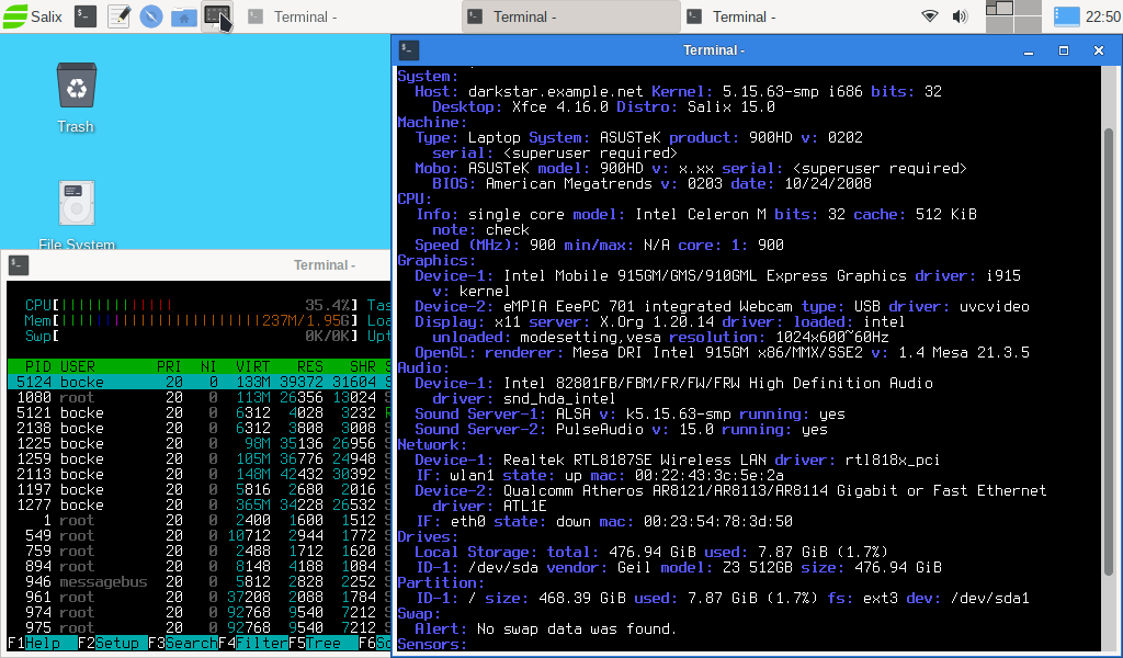 Postaviću kad stignem. Ova mašina ima 2 GB rama pa pokreće Slackware Live Xfce bez problema. Ali nažalost ne radi instalacija na disk. Fali 200-300 MB.