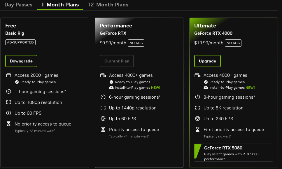 Postoji 3 nivoa usluge: Free, Performance i Ultimate. Svaki paket ima svoja ograničenja. Na primer i najskuplji nalog ne uključuje stalni SSD nego se sačuvane igre gube nakon igre. Postoje ograničenja koliko se dugo može igrati (4/6/8 h) i ograničenje koliko sati mesečni. No, dosta ovoga se može dodatno doplatiti (mesečno): moguće je doplatiti statički SSD gde se čuvaju podaci igre i sačuvane igre (save games). Takođe je moguće doplatiti dodatne sate.