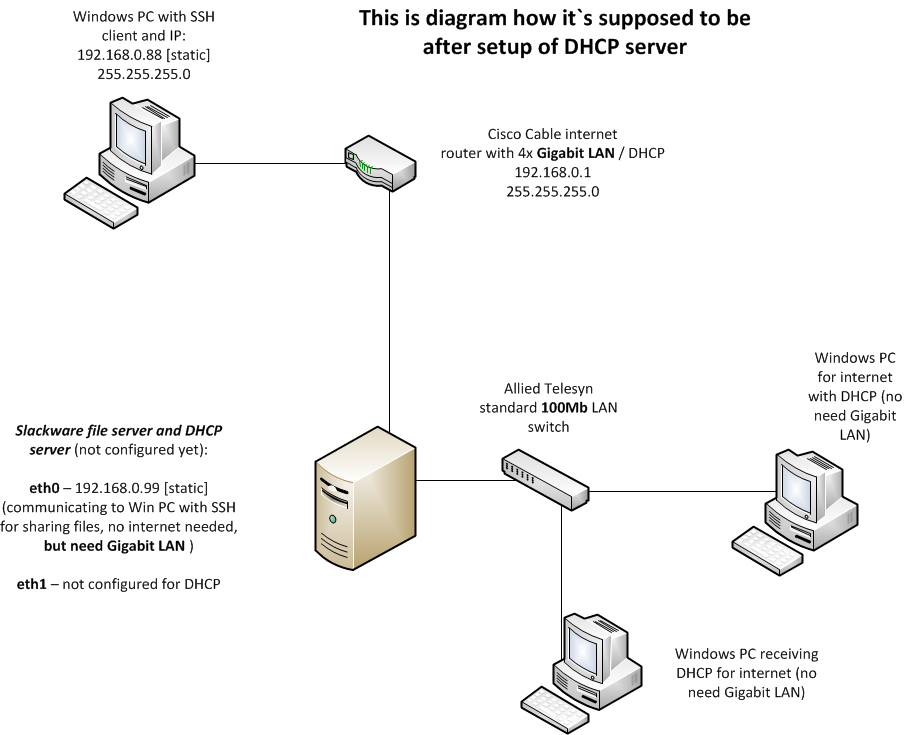 - eth1 je dhcp server i on ima adresu 192.168.0.98 (probao sam i 10.0.0.10 da mu dodelim, ali onda opseg za dhcp server mora da bude u tom opsegu).