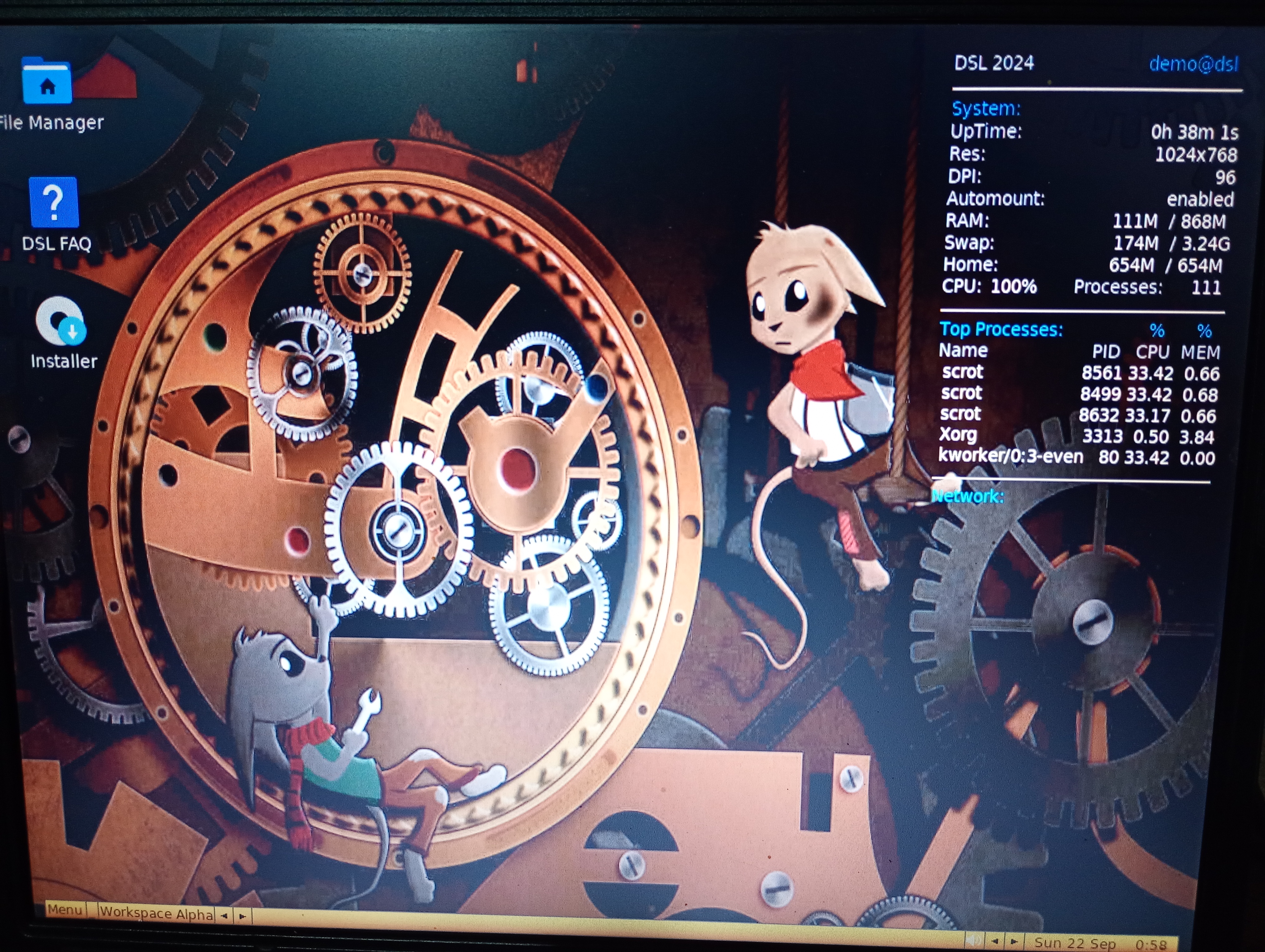 Za svrhu prezentacije distroa, testiranje sam uradio na laptopu starom preko 15 godina. AMD Turion, procesor sa jednim jezgrom, 1 GB ram memorije.